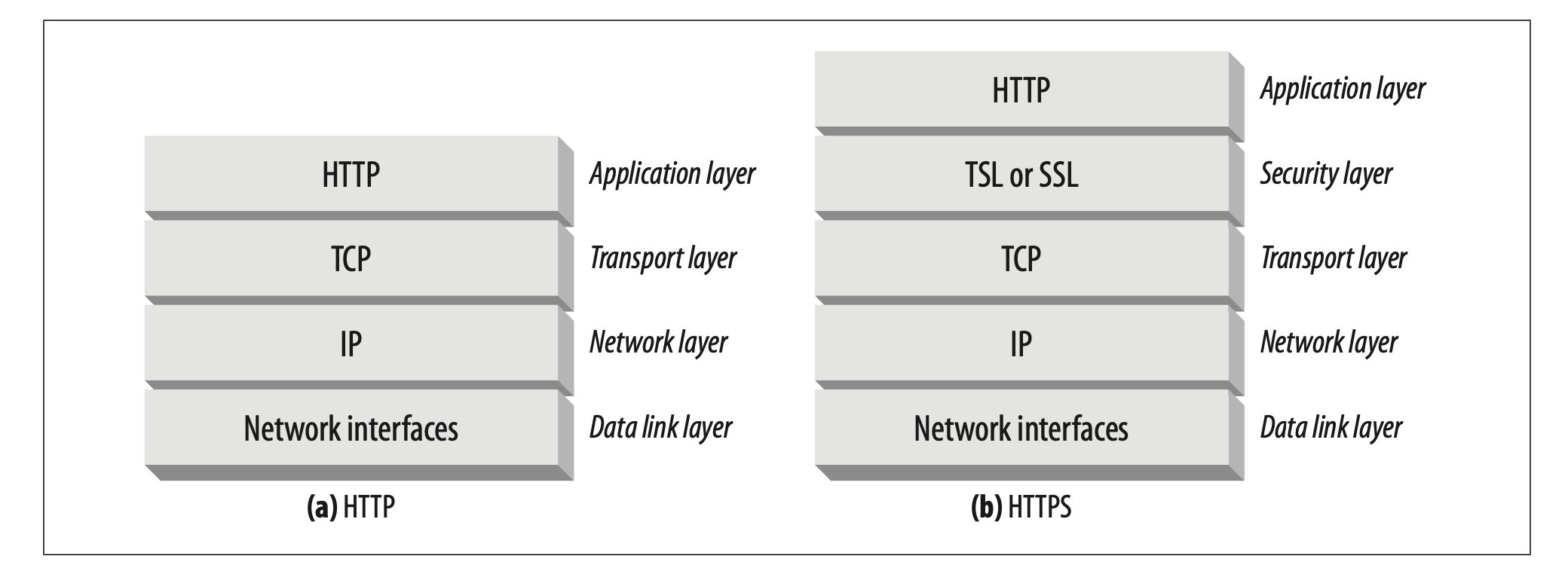 - HTTPS: all HTTP requests/responses is encrypted before being sent. HTTPS works by providing a secured layer (SSL).